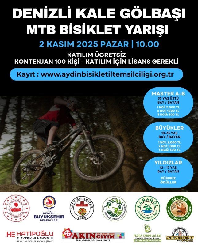 Denizli ili Kale ilçe Belediyesi, Gölbaşı Mahalle Muhtarlığı tarafından düzenlenen “Kale Gölbaşı Dağ Bisiklet Yarışı” 02.11.2025 tarihinde Denizli ili Kale ilçesi, Gölbaşı mahallesin’de yapılacaktır.